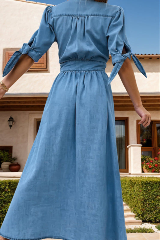 Collared Neck Tie Waist Short Sleeve Denim Dress