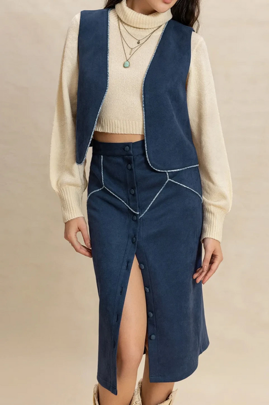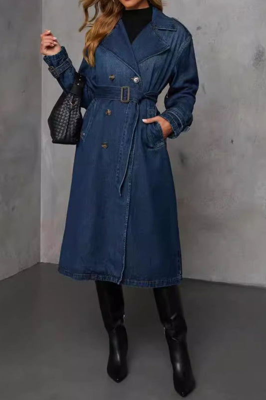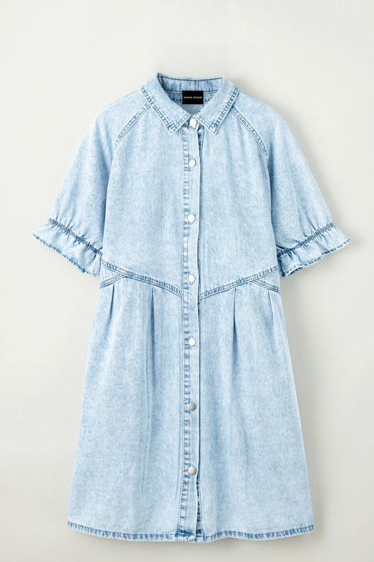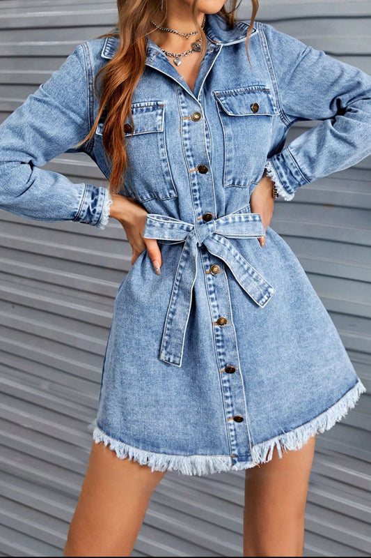 Raw Hem Collared Neck Long Sleeve Denim Dress