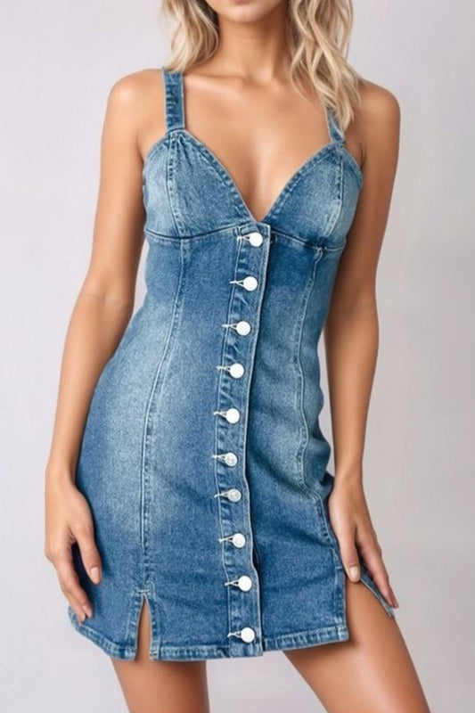 Button Front Chest Pockets Sleeveless Slim Mini Denim Dress
