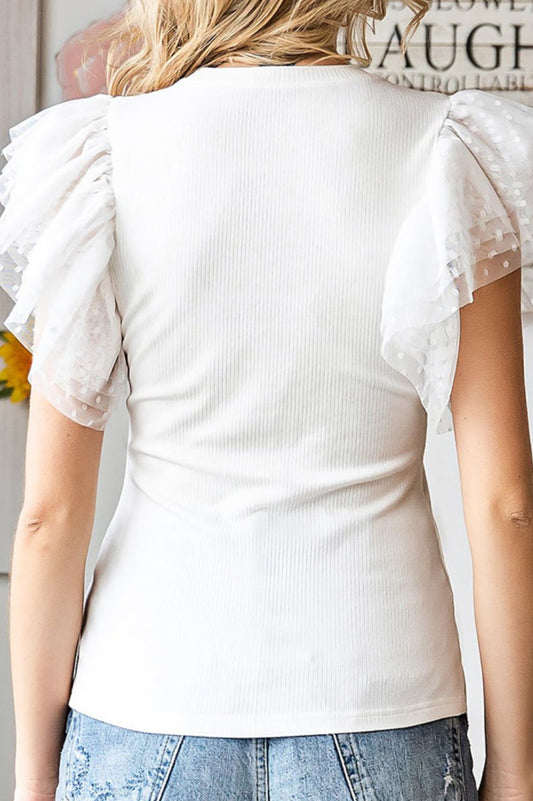 Ruffle Short Puff Sleeve Button Down Denim Shirt
