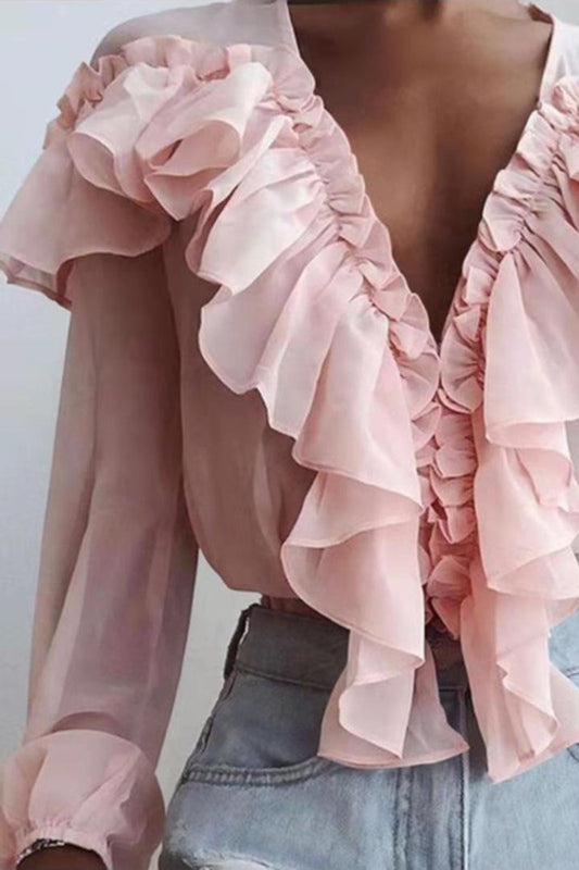 Ruffled V-Neck Long Sleeve Blouse