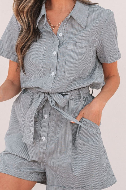 Stripe Chest Pockets Tie Waist Romper