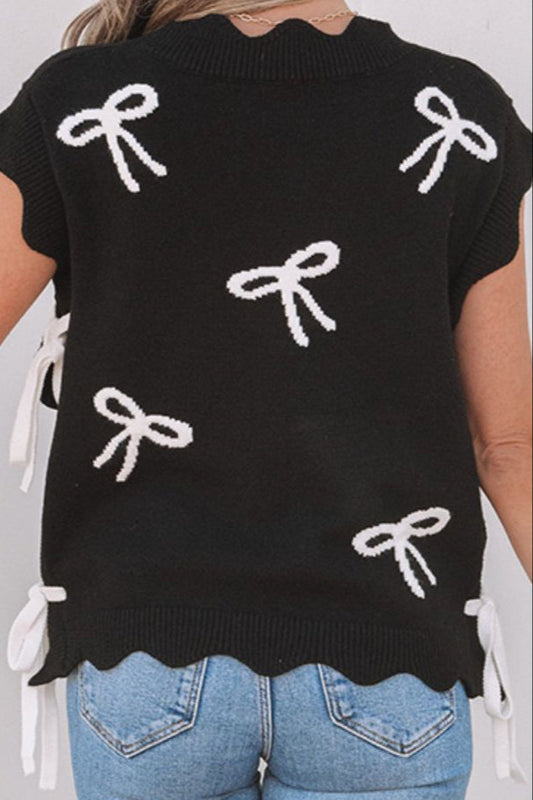 Bow Side Ties Scalloped Hem Cap Sleeve Sweater