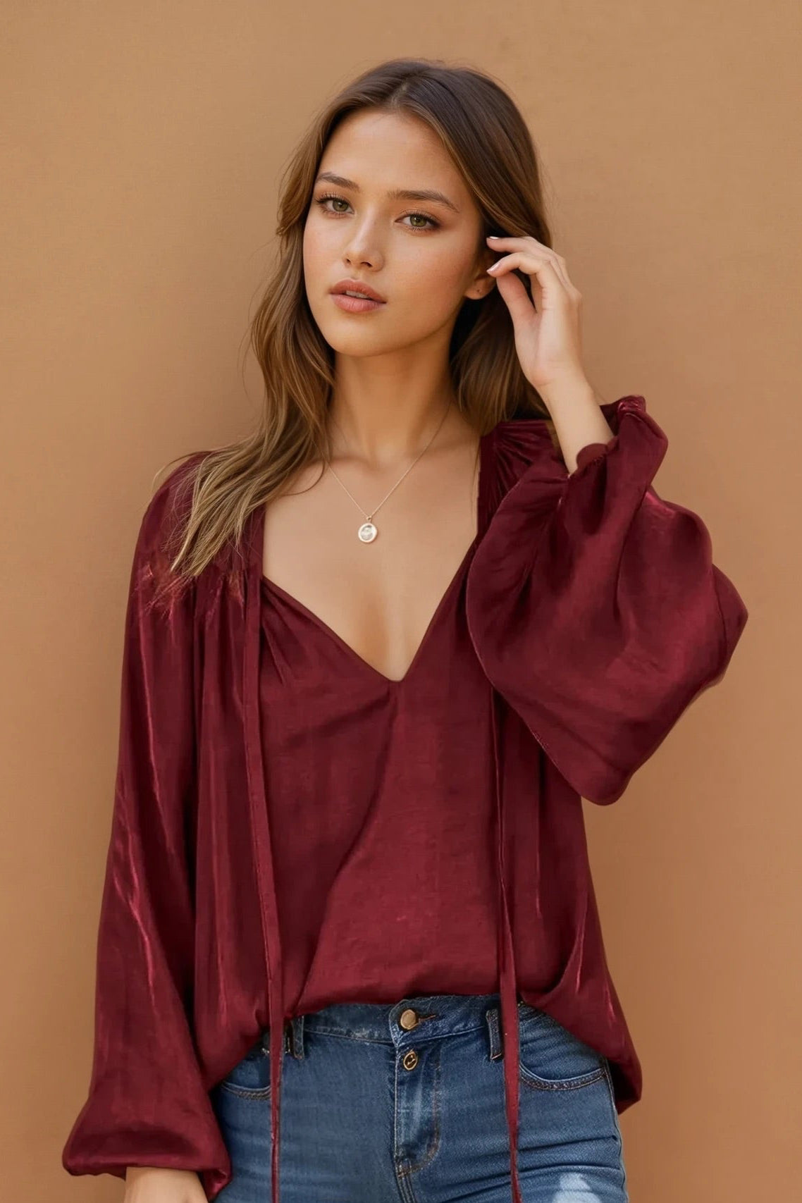 Ruched Tie Neck Balloon Sleeve Blouse